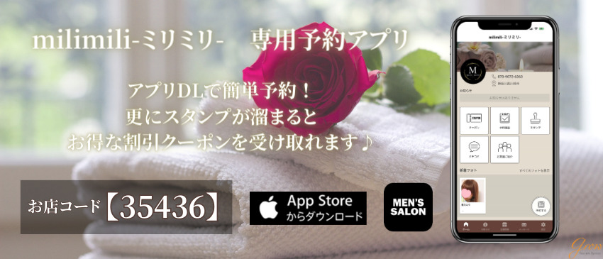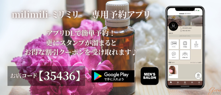 完全予約制・完全個室のリラクゼーションサロン、メンズエステ「mili mili」ミリミリでございます。